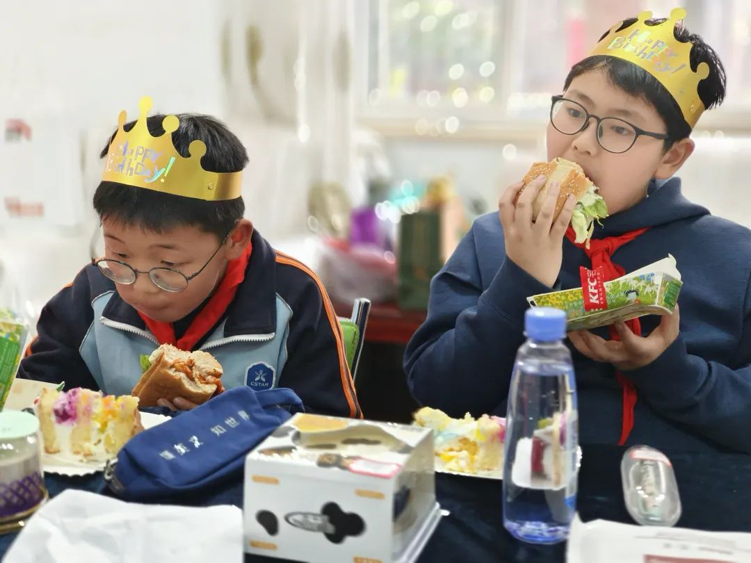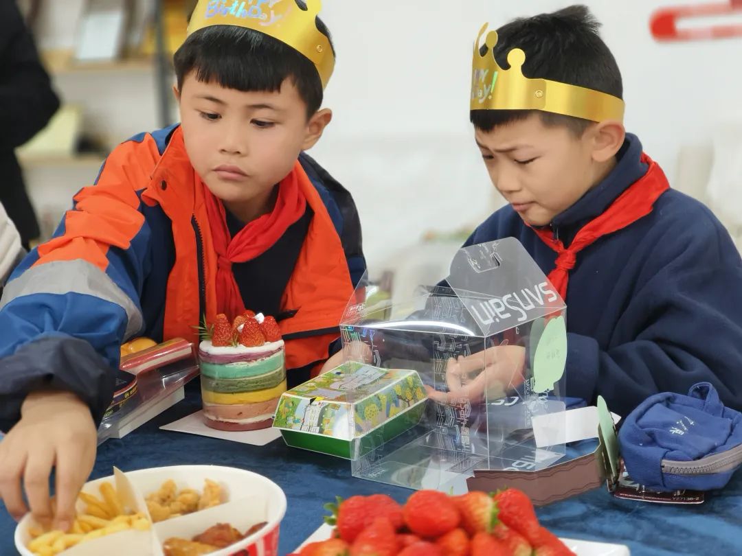 餐桌上 ,金黄的汉堡、酥脆的薯条,还有点缀着新鲜水果的生日蛋糕 ,以及森林学校专属的定制礼物,校长爸爸轻轻摸着孩子们的头,温柔地说:“以后每个月都会有生日会,你们安心长大,我们负责让你们一直笑着长大 。”简单的话语,却饱含着无尽的爱与承诺,让孩子们感受到了家的温暖 。